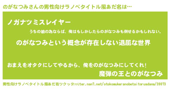 | ヘコむあだ名 | 『のがなつみ(爆)』『牛乳』『のがを』 |