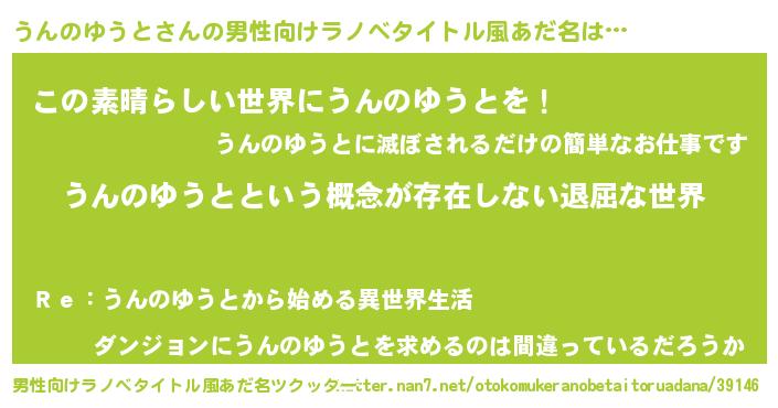 | 女子向けラノベタイトル風あだ名 | 『異世界で失敗しない100のうんのゆうと』 |