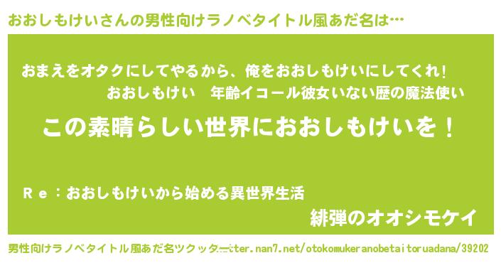 | 女子向けラノベタイトル風あだ名 | 『悪役おおしもけいに転生したようですが、知った事ではありません』 |