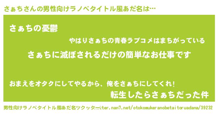 | 胡散臭い通販商品みたいなあだ名 | 『億万長者になれるブレスレット…その名も「さぁち」』 |
