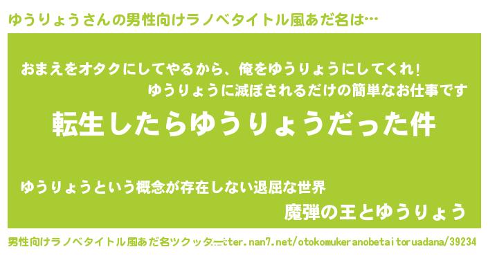 | 女子向けラノベタイトル風あだ名 | 『ゆうりょうの玉の輿計画!』 |