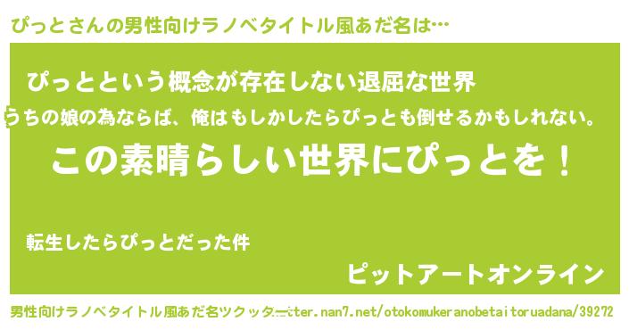 | 女子向けラノベタイトル風あだ名 | 『悪役ぴっとに転生したようですが、知った事ではありません』 |