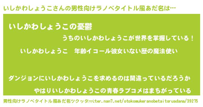 | 女子向けラノベタイトル風あだ名 | 『いしかわしょうこの玉の輿計画!』 |