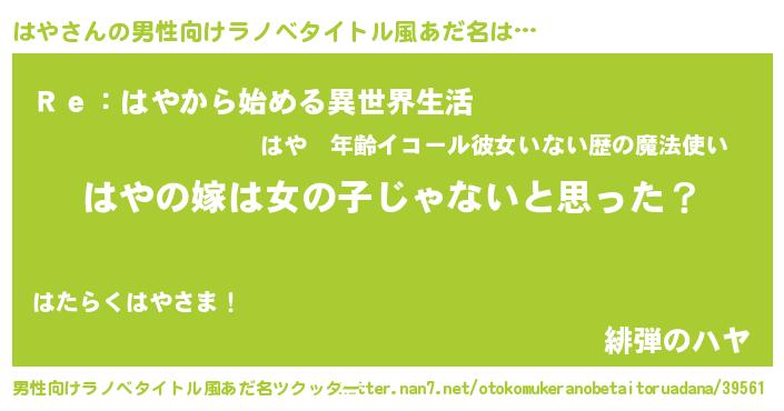 | 女子向けラノベタイトル風あだ名 | 『はや様がみてる』『闇のはや』 |