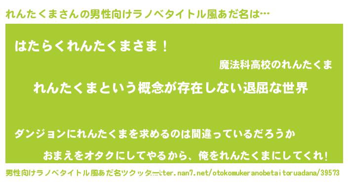 | 女子向けラノベタイトル風あだ名 | 『異世界で失敗しない100のれんたくま』 |