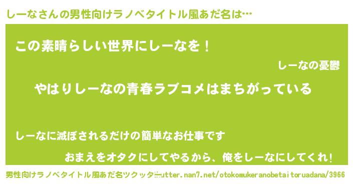 | 女子向けラノベタイトル風あだ名 | 『しーなの雑貨屋さん』 |