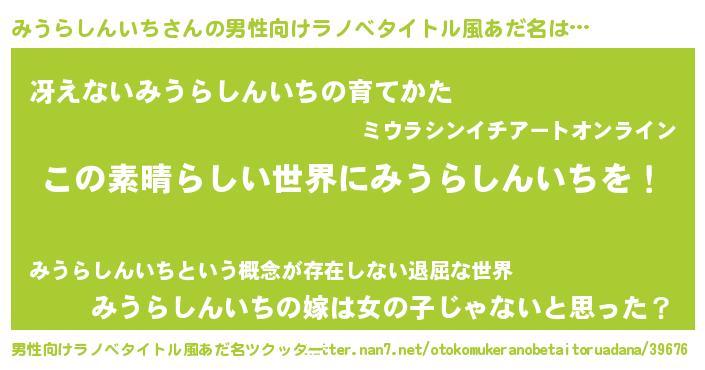 | 女子向けラノベタイトル風あだ名 | 『乙女ゲームの破滅フラグしかない悪役みうらしんいちに転生してしまった…』 |
