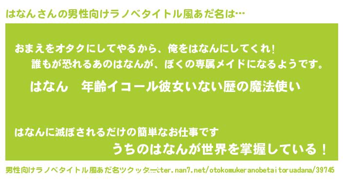 | ヘコむあだ名 | 『はなん(苦笑)』『はなもー』『牛乳』 |