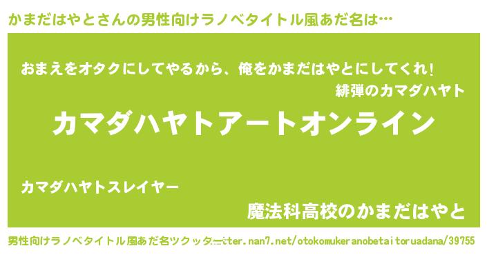 | 女子向けラノベタイトル風あだ名 | 『誰かこのかまだはやとを説明してください! ~契約から始まるウェディング~』 |