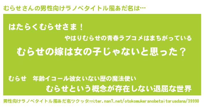 | 女子向けラノベタイトル風あだ名 | 『むらせの卵を拾いまして』 |