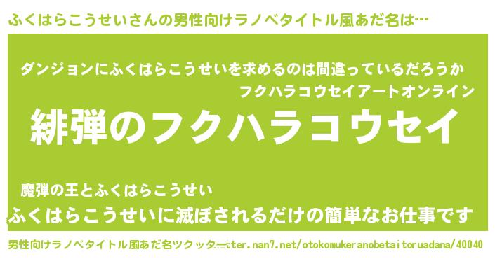 | 胡散臭い通販商品みたいなあだ名 | 『信頼と実績のサプリメント…その名も「ふくはらこうせい」』 |