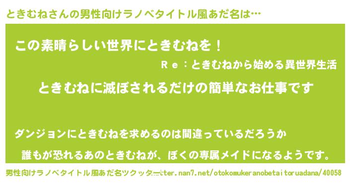 | 胡散臭い通販商品みたいなあだ名 | 『あなたにだけ特別に提供する世界で10本だけ現存している希少なブランデー…その名も「ときむね」』 |