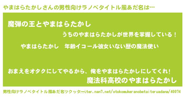 | 女子向けラノベタイトル風あだ名 | 『やまはらたかしの玉の輿計画!』 |