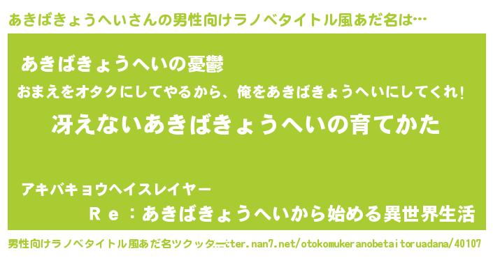 | 胡散臭い通販商品みたいなあだ名 | 『モテモテ間違いなし霊験あらたかなお札…その名も「あきばきょうへい」』 |