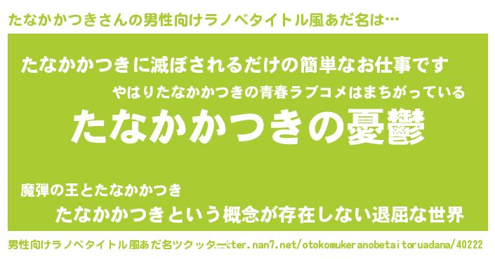 | 女子向けラノベタイトル風あだ名 | 『(仮)たなかかつきのやんごとなき事情』 |
