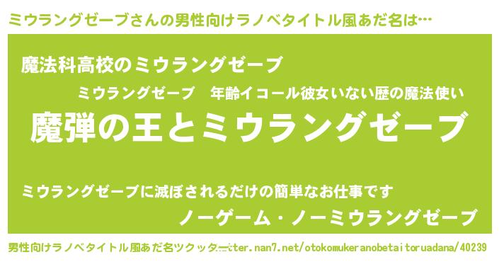 | 女子向けラノベタイトル風あだ名 | 『ミウラングゼーブが死なない童話 林檎のミウラングゼーブの診療簿』 |