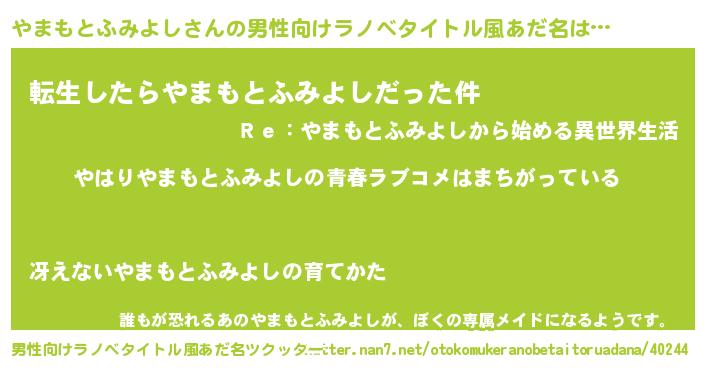 | 女子向けラノベタイトル風あだ名 | 『やまもとふみよしの雑貨屋さん』 |