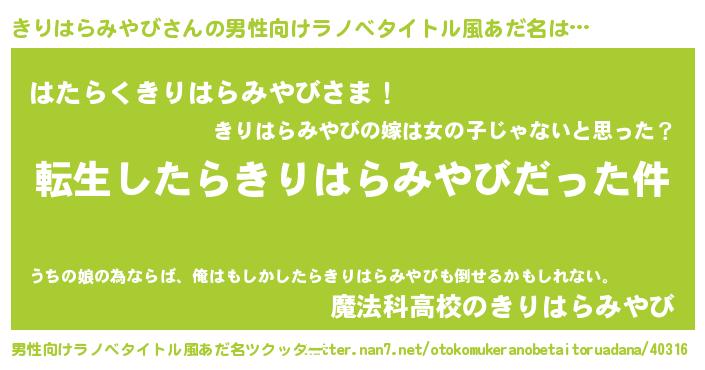 | 胡散臭い通販商品みたいなあだ名 | 『テレビで話題のアガリクス…その名も「きりはらみやび」』 |