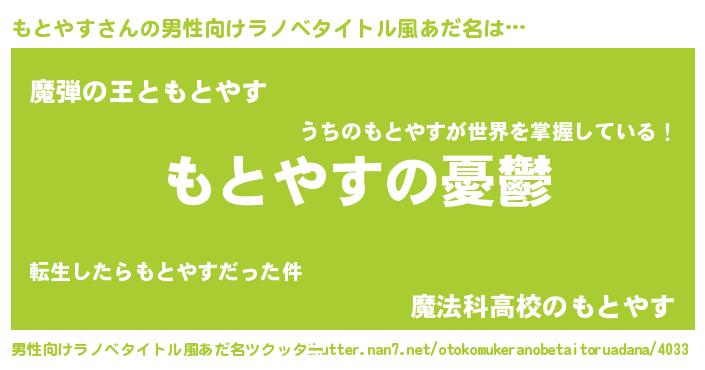 | 女子向けラノベタイトル風あだ名 | 『(仮)もとやすのやんごとなき事情』 |