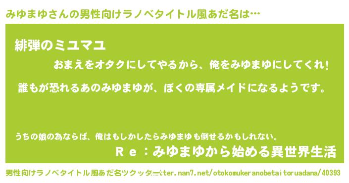| 胡散臭い通販商品みたいなあだ名 | 『来世でも幸せになれる健康食品…その名も「みゆまゆ」』 |