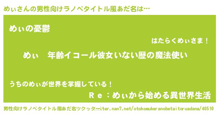 | 女子向けラノベタイトル風あだ名 | 『めぃの玉の輿計画!』『闇のめぃ』 |