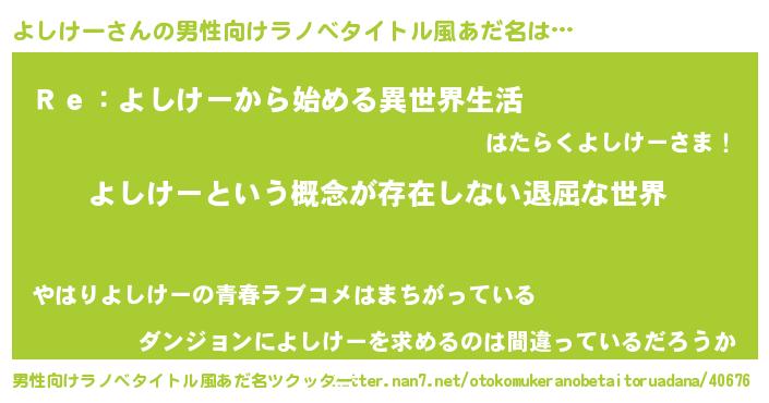 | ヘコむあだ名 | 『よしけー(苦笑)』『よしを』『牛乳』 |