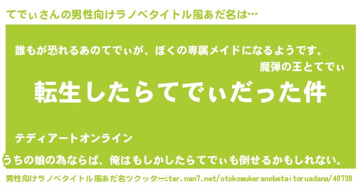 | 女子向けラノベタイトル風あだ名 | 『てでぃの玉の輿計画!』 |