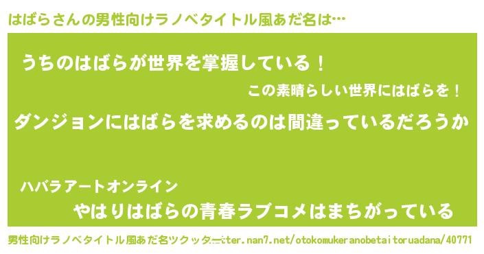 | 女子向けラノベタイトル風あだ名 | 『はばらの卵を拾いまして』 |