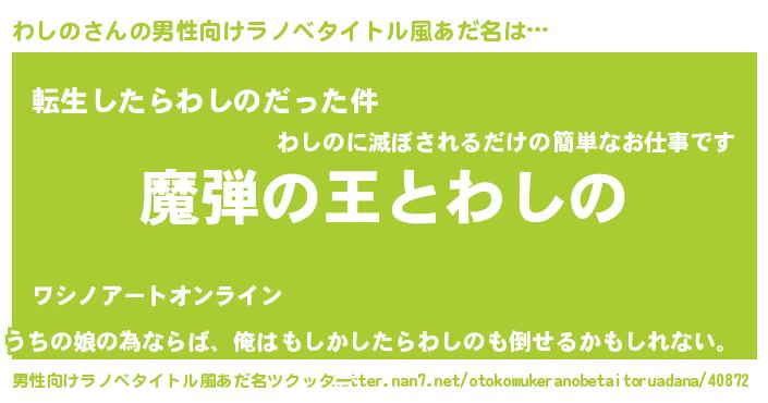 | 女子向けラノベタイトル風あだ名 | 『わしのが死なない童話 林檎のわしのの診療簿』 |