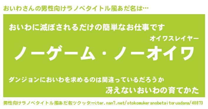 | 女子向けラノベタイトル風あだ名 | 『おいわ恋絵巻』『横柄おいわと宰相陛下』 |