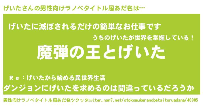 | 意味不明あだ名 | 『住所不定無職げいた(85歳)』『自称げいた』 |