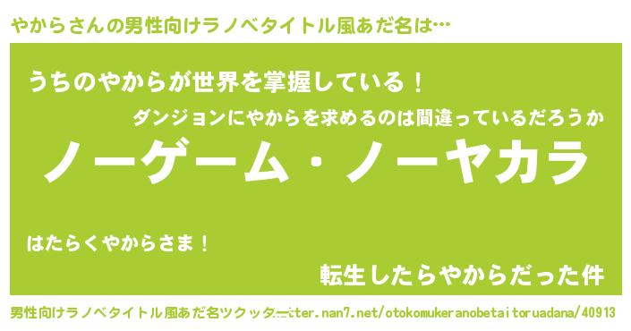 | 女子向けラノベタイトル風あだ名 | 『死神やからの再婚』 |