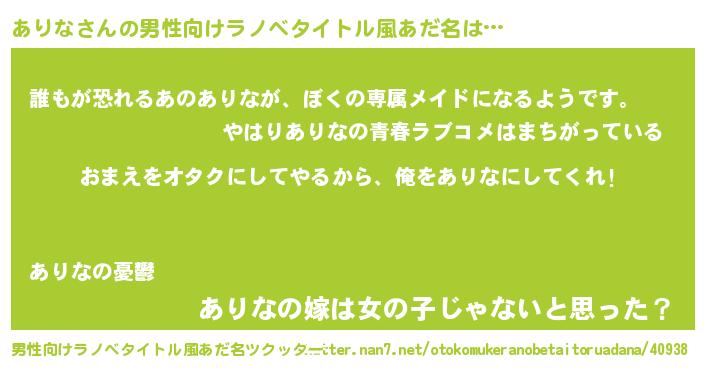 | 女子向けラノベタイトル風あだ名 | 『ありな夫妻のなれそめ』 |