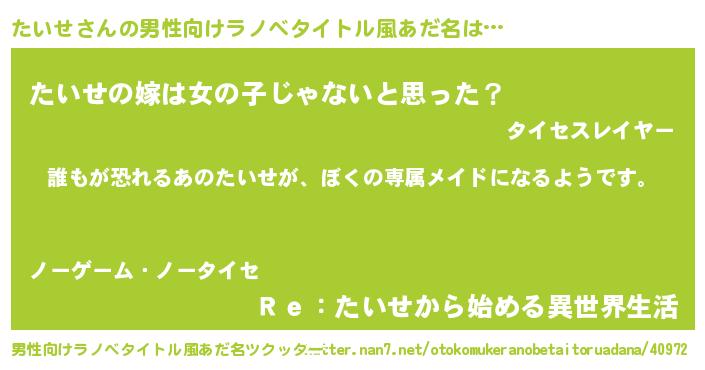 | 胡散臭い通販商品みたいなあだ名 | 『来世でも幸せになれる健康食品…その名も「たいせ」』 |