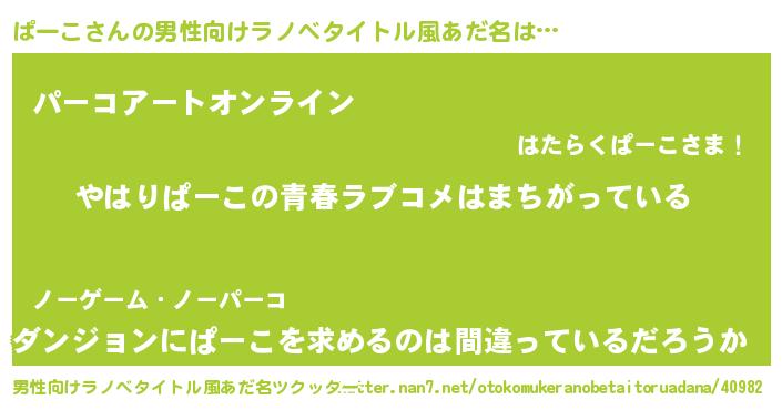 | 女子向けラノベタイトル風あだ名 | 『ぱーこの雑貨屋さん』『ぱーこ恋絵巻』 |