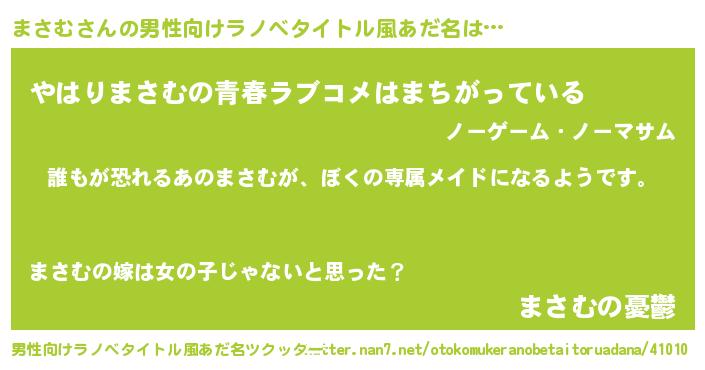 | 女子向けラノベタイトル風あだ名 | 『まさむの契約王妃』『まさむ恋絵巻』 |