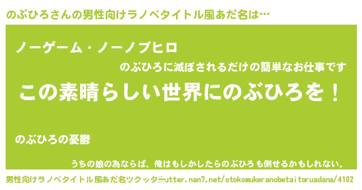| 女子向けラノベタイトル風あだ名 | 『乙女ゲームの破滅フラグしかない悪役のぶひろに転生してしまった…』 |
