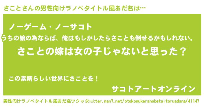 | 女子向けラノベタイトル風あだ名 | 『さこと様がみてる』『死神さことの再婚』 |