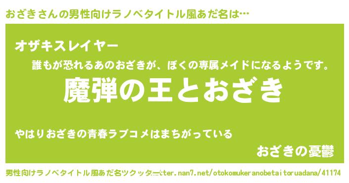 | 女子向けラノベタイトル風あだ名 | 『乙女ゲームの破滅フラグしかない悪役おざきに転生してしまった…』 |