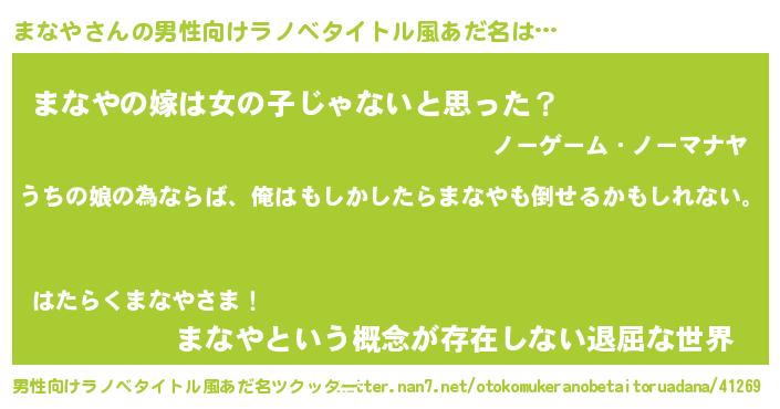 | 女子向けラノベタイトル風あだ名 | 『まなやの婚約者』『まなや様がみてる』 |