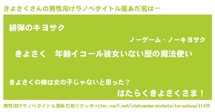 | 女子向けラノベタイトル風あだ名 | 『きよさくの玉の輿計画!』 |
