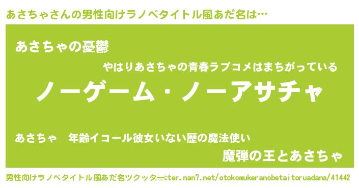| 女子向けラノベタイトル風あだ名 | 『死神あさちゃの再婚』 |