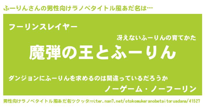 | 女子向けラノベタイトル風あだ名 | 『乙女ゲームの破滅フラグしかない悪役ふーりんに転生してしまった…』 |