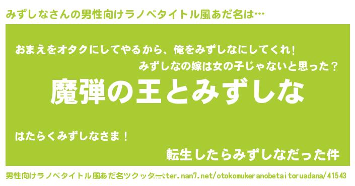 | 女子向けラノベタイトル風あだ名 | 『みずしなが死なない童話 林檎のみずしなの診療簿』 |