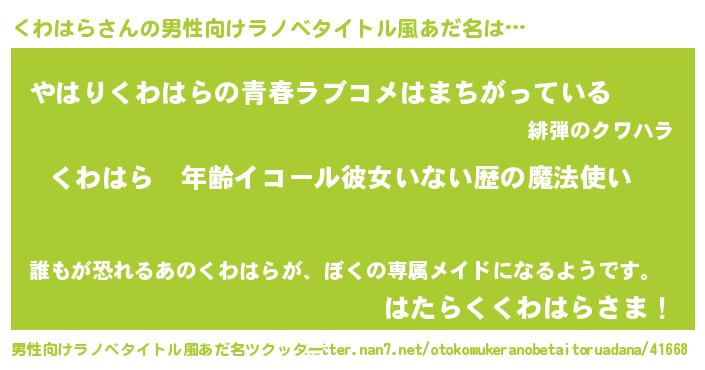 | 女子向けラノベタイトル風あだ名 | 『くわはらの玉の輿計画!』 |