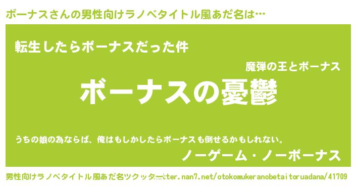 | 女子向けラノベタイトル風あだ名 | 『(仮)ボーナスのやんごとなき事情』 |