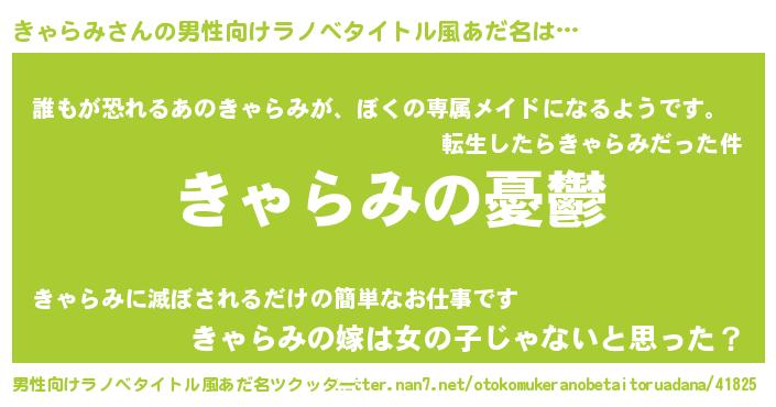 | 女子向けラノベタイトル風あだ名 | 『(仮)きゃらみのやんごとなき事情』 |