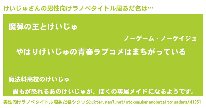 | ヘコむあだ名 | 『豆乳』『けいじゅ(笑)』『けい太郎』 |