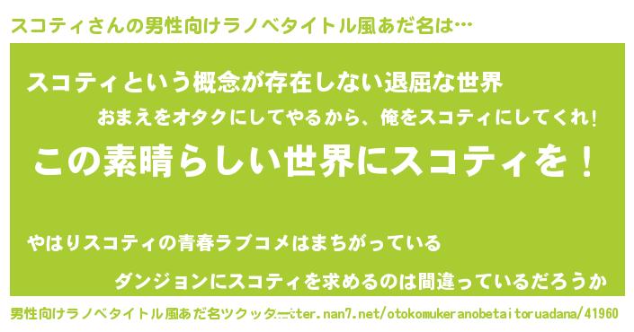 | 意味不明あだ名 | 『住所不定無職スコティ(6歳)』 |