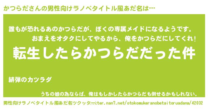 | 胡散臭い通販商品みたいなあだ名 | 『来世でも幸せになれる健康食品…その名も「かつらだ」』 |